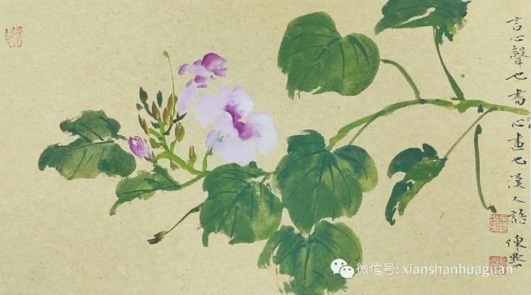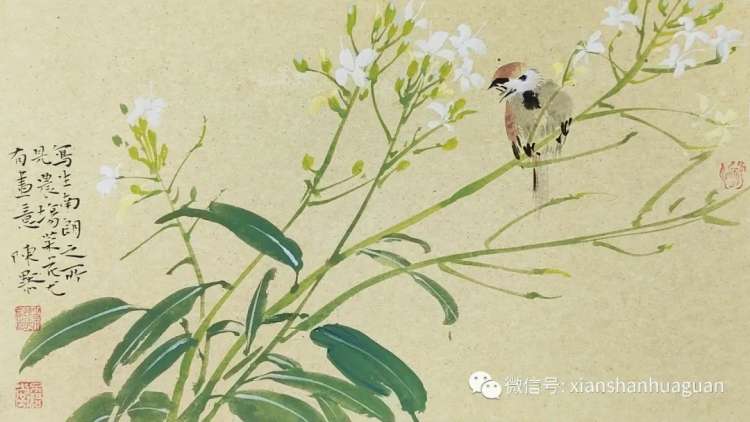 陈默是信阳人,北国的江南,再看他画的花鸟,总有一种如雨后的清新,那就不奇怪了。陈默偏爱写花花草草,平日忙于课徒,教学之余,竟能在心田里滋润出一围春意盎然的“花园”。他的花鸟画,敷色明丽而不坠柔靡,意境幽淡而不失生气。笔致俊逸,题材多是篱间小景,香花满径,鸣禽傍枝,一派田园的旖旎。