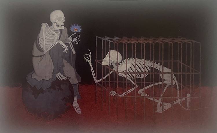 黄氏偏爱白骨,也喜查白骨。世人却恐惧之。然则,华服之下,皮肉之内,人皆藏白骨一具,人死则白骨现。人仍害怕死亡,也就害怕人骨。他亦怕死,但不惧白骨。骨相较于皮肉的柔软与弹性,更呈现的是一种刚性的力量。皮肉在外,千人千面,肤色各异,身材迥别。而骨骼在内,形态-致,差别甚微。不同于皮肉外表变化多样的物质性,骨骼体现的是不变的精神性,直通人的重魂。
